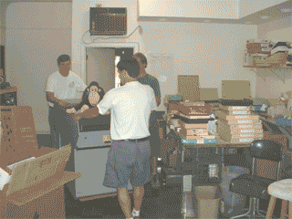 ![]() Doug's arm, Evan, Monkey, & Claude prepare to load the Paper Processor into the van.  |