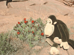 Sunday, 4th-of-July burst of color! Cactus flowers are brilliant, aren't they? And we all know how much Monkey loves flowers, don't we? Oh, dear, there's gonna be trouble, isn't there? Monkey can't resist stopping to smell (and pick) beautiful flowers, even if they're protected by thorns. Remember his misadventure with the lemon tree? If you wanna see what happened when my back was turned, click the cactus. (111k file)  |